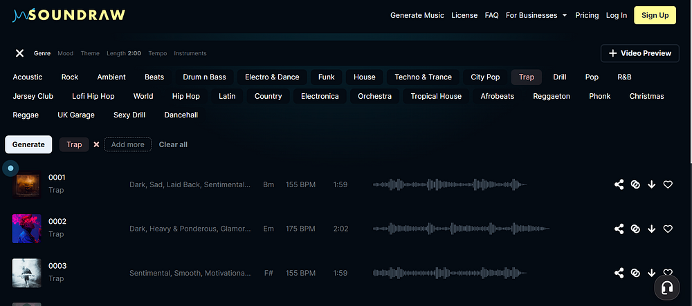 For the sake of testing, I selected “Trap” as my genre. In just seconds, the tool generated these tracks for me.