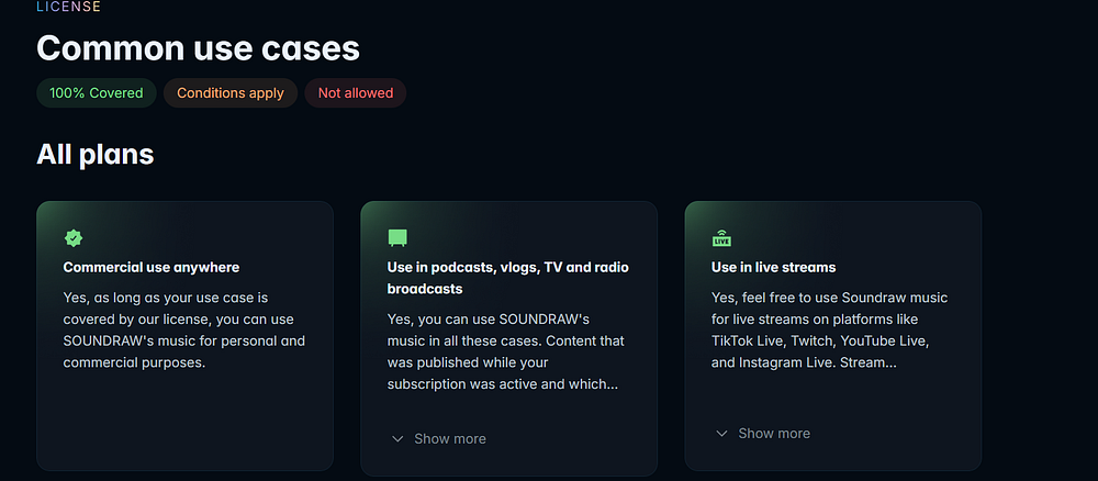 The tracks created with Soundraw are royalty-free, and the tracks you generate are legally yours. Soundraw is trained with their in-house music only.